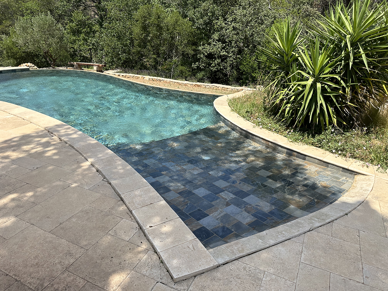 Nous avons choisi des matériaux capables de résister aux conditions climatiques du sud de la France. Le revêtement de la plage utilise des pierres naturelles aux nuances variées. Ces tonalités rappellent les couleurs des roches présentes dans la région de Gassin. De plus, les margelles en pierre claire assurent une bonne résistance à la chaleur. Elles restent agréables au contact, même en plein été. Le fond du bassin se compose d’un carrelage minéral qui crée un effet de profondeur dans l’eau. Ce choix accentue la couleur turquoise et apporte un rendu très naturel. Grâce à cette combinaison de matériaux, l’ensemble conserve son esthétique dans le temps.